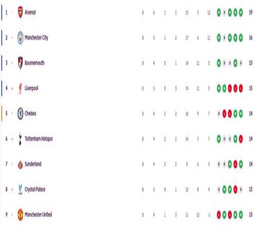 英超最新积分榜方面,阿森纳8轮6胜1平1分以19分领跑,曼城16分第二落后枪手3分。利物浦各项赛事遭遇四连败,其中英超三连败,已经从榜首跌至第四。伯恩茅斯和红军同积15分,排在第3。曼联全取三分后攀升至第9的位置。