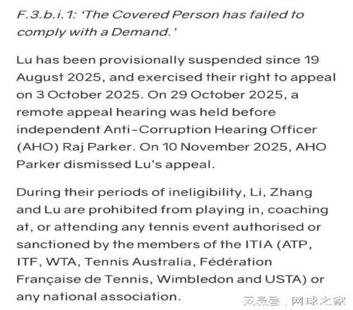 按照ITIA规定,禁赛期间三位选手被禁止参与、执教或出席任何由ITIA成员及各国网球协会授权的赛事,这一禁令覆盖了全球所有顶尖网球赛事。