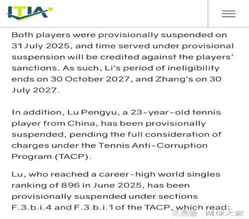 情况如下:国际网球诚信机构(ITIA)近日公布对中国网球选手李文夫、张瑾和陆鹏宇的处罚决定,两位“00后”小将因操纵比赛牟利遭禁赛,另一人因违反反腐败规定被临时停赛且上诉被驳回,具体禁赛时间还需要国际反腐败机构的进一步考虑和裁定。