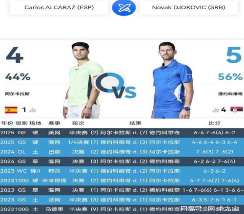 职业生涯至今,阿尔卡拉斯和德约科维奇交锋九次,四胜五负落后对手,不过大满贯赛场,两人交锋五次,阿尔卡拉斯三胜两负领先对手。2023、2024年温网决赛,阿尔卡拉斯以初生牛犊不怕虎的冲劲,竟然连续两年将七届温网冠军德约科维奇掀翻在地,笑傲温布尔登。
