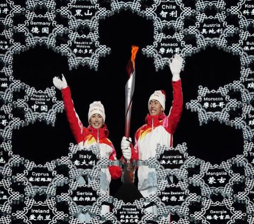 2022年2月4日,北京冬奥会开幕式上,中国代表团运动员赵嘉文(右)、迪妮格尔·衣拉木江点燃主火炬。